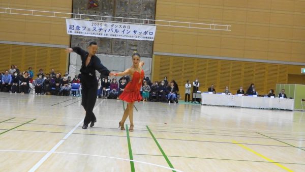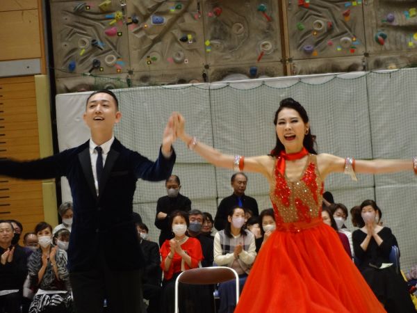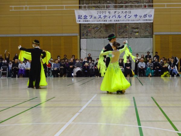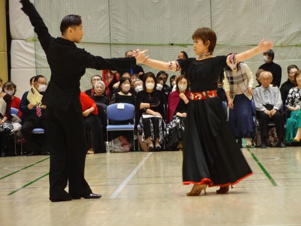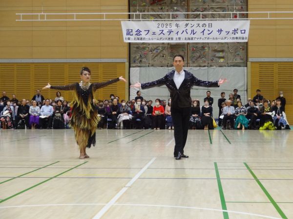 | 2023年ダンスの日記念フェステバルインサッポロは、11月24日(金)12:00~16:00 北海きたえーるサブアリーナにて開催されました。今年は、コロナ感染対策も緩和され入場制限もなくコロナ前の状態での開催となり約650名のダンスフアンが集まりました。イベントとしてはフリーペアコンペ初級・中級が各12組・アマ・プロデモンストレーションが15組そしてアマデモが1組プロデモが1組、アマデモには秋山勇太朗&ソランキ・ソニア組・プロデモには鈴木隼先生&鈴木恵先生ご夫妻に披露して頂きました。また、ダンスタイムも約2時間あり、お客様も大いに楽しんでいました。 |